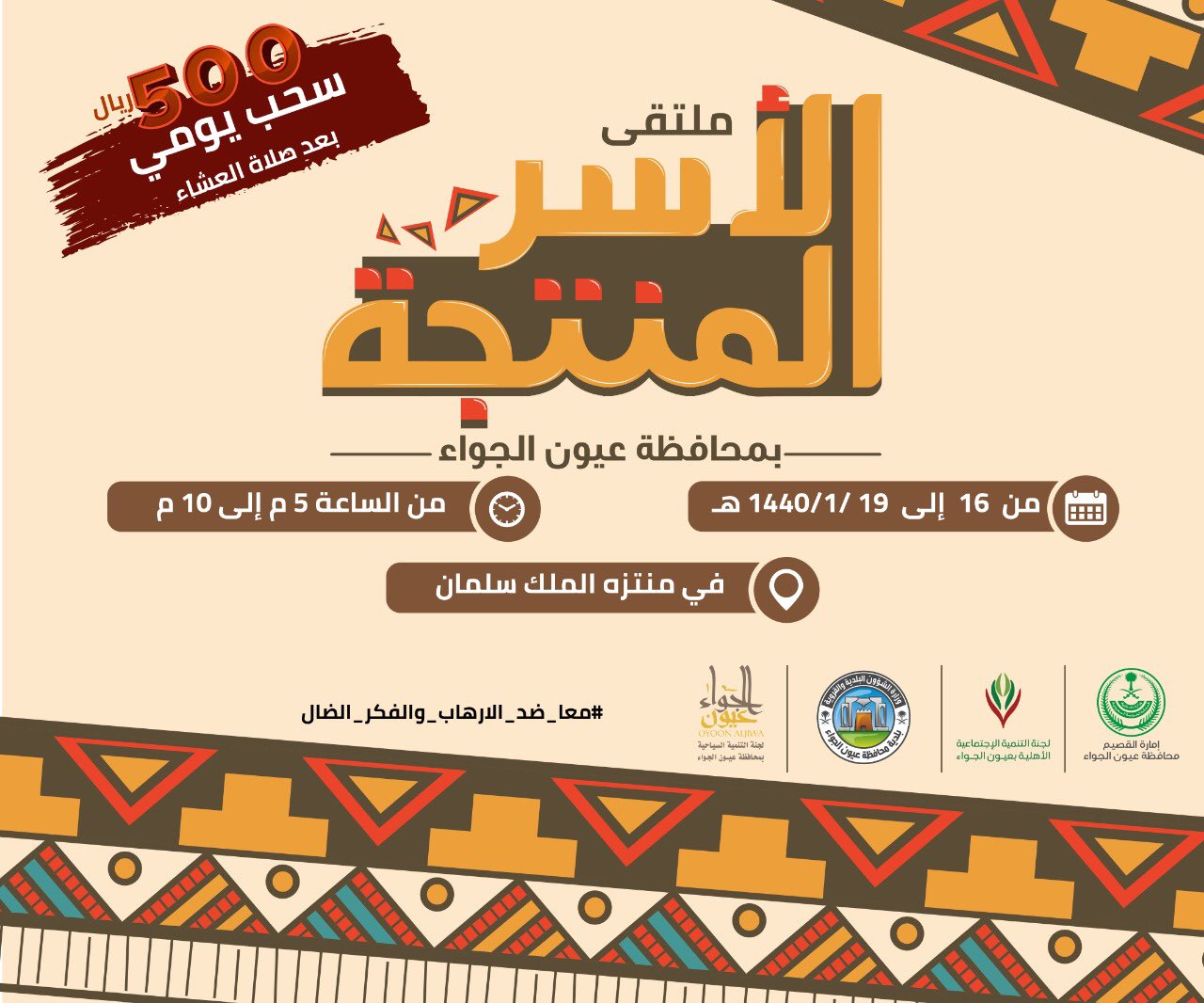 لجنة التنمية السياحية بمحافظة عيون الجواء On Twitter اليوم انطلاقة ملتقى الأسر المنتجة في منتزه الملك سلمان من الساعة الخامسة عصر ا حتى العاشرة ليل ا سحب يومي على ٥٠٠ ريال عيون الجواء السياحة القصيم Https T Co N7e0zpvjyg