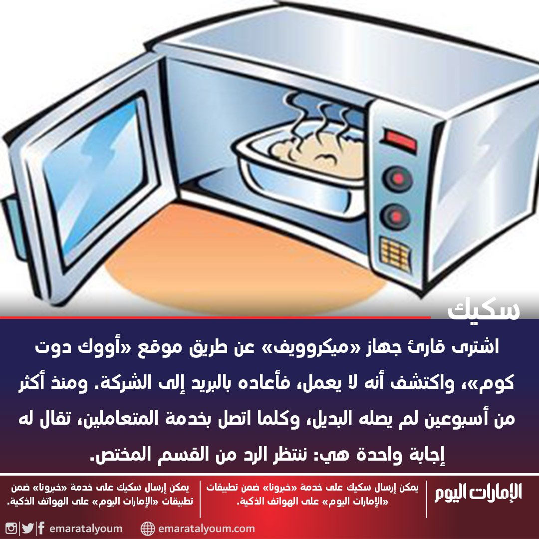 الإمارات اليوم على تويتر سكيك اشترى قارئ جهاز ميكروويف عن طريق موقع أووك دوت كوم واكتشف أنه لا يعمل فأعاده بالبريد إلى الشركة ومنذ أكثر من أسبوعين لم يصله البديل وكلما اتصل
