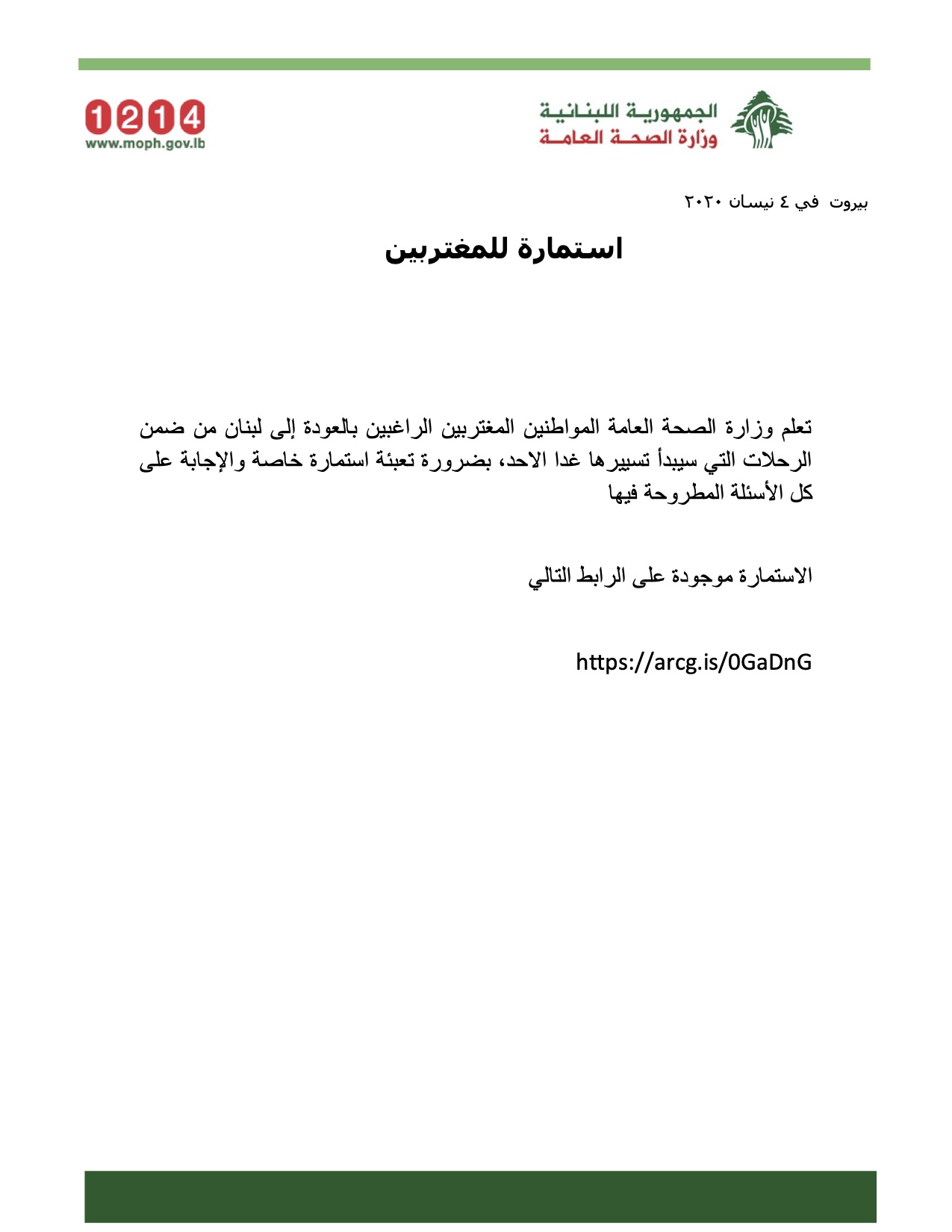 Ministry Of Public Health Lebanon A Twitter بيروت في ٤ نيسان ٢٠٢٠ استمارة للمغتربين تعلم وزارة الصحة المواطنين المغتربين الراغبين بالعودة إلى لبنان من ضمن الرحلات التي سيبدأ تسييرها غدا الأحد