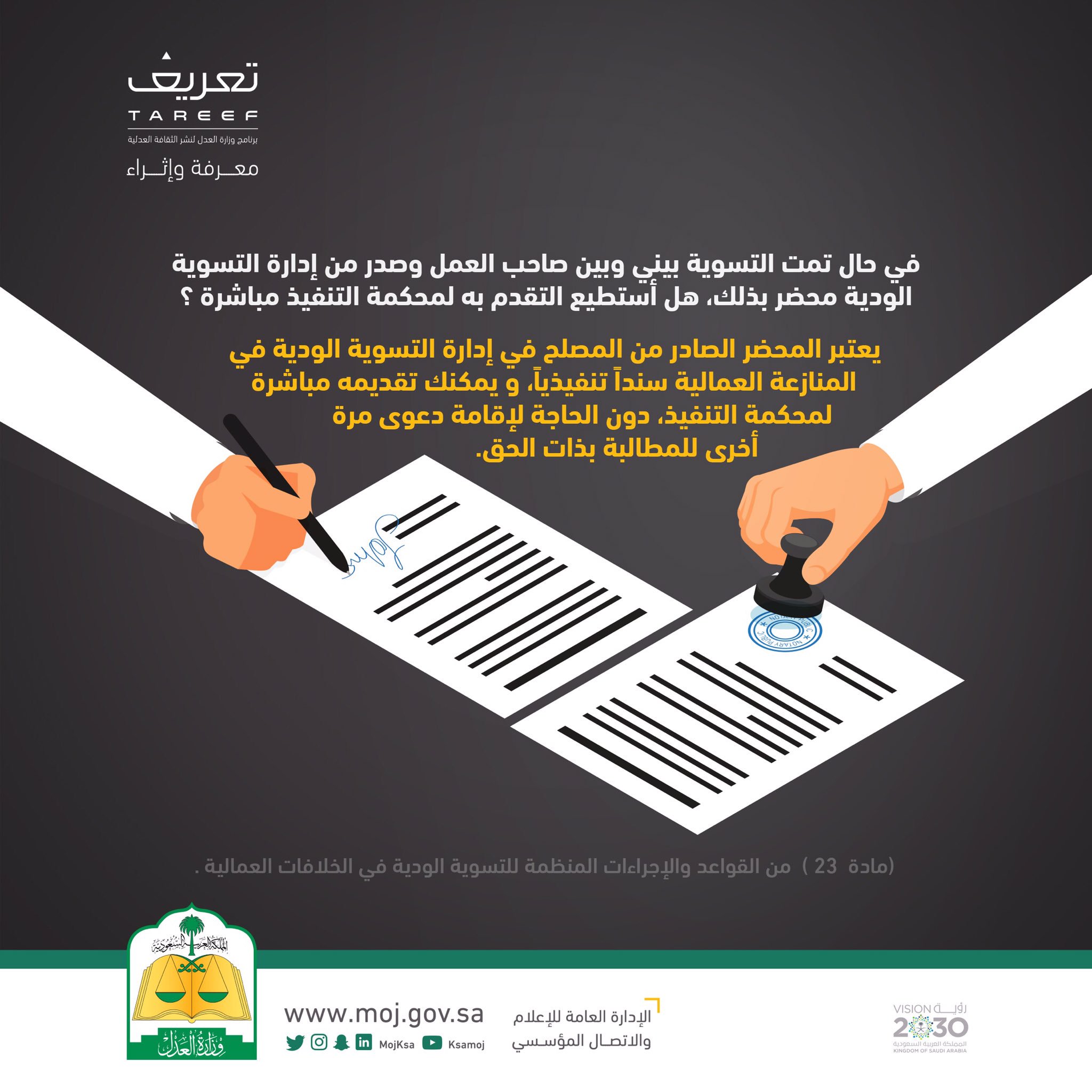 وزارة العدل ادارة التسويات الودية. إدارة التوثيقات الشرعية تستقبل مراجعيها للحالات الضرورية والمعاملات الطارئة والعاجلة فقط. المنازعات المتعلقة. اصدرت وزارة العدل اليوم الأربعاء دليل ا عدلي ا يضم نحو 50 إجابة متنوعة عن أسئلة المستفيدين حول القضاء العمالي من أبرزها حقوق وواجبات العاملين وأصحاب الأعمال بالإضافة إلى طريقة التقاضي ومراحله. بوابة الخدمات الإلكترونية للجهات الغير ربحية.