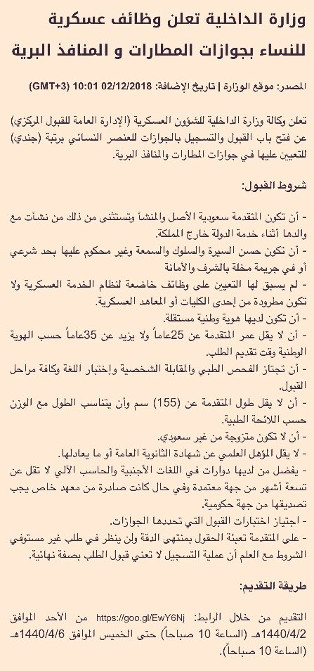 دليل الأحساء On Twitter وظائف نسائية وزارة الداخلية تعلن وظائف عسكرية للنساء بجوازات المطارات و المنافذ البرية التقديم من الأحد الموافق 1440 4 2هـ الساعة 10 صباحا حتى الخميس الموافق 1440 4 6هـ الساعة 10 صباحا